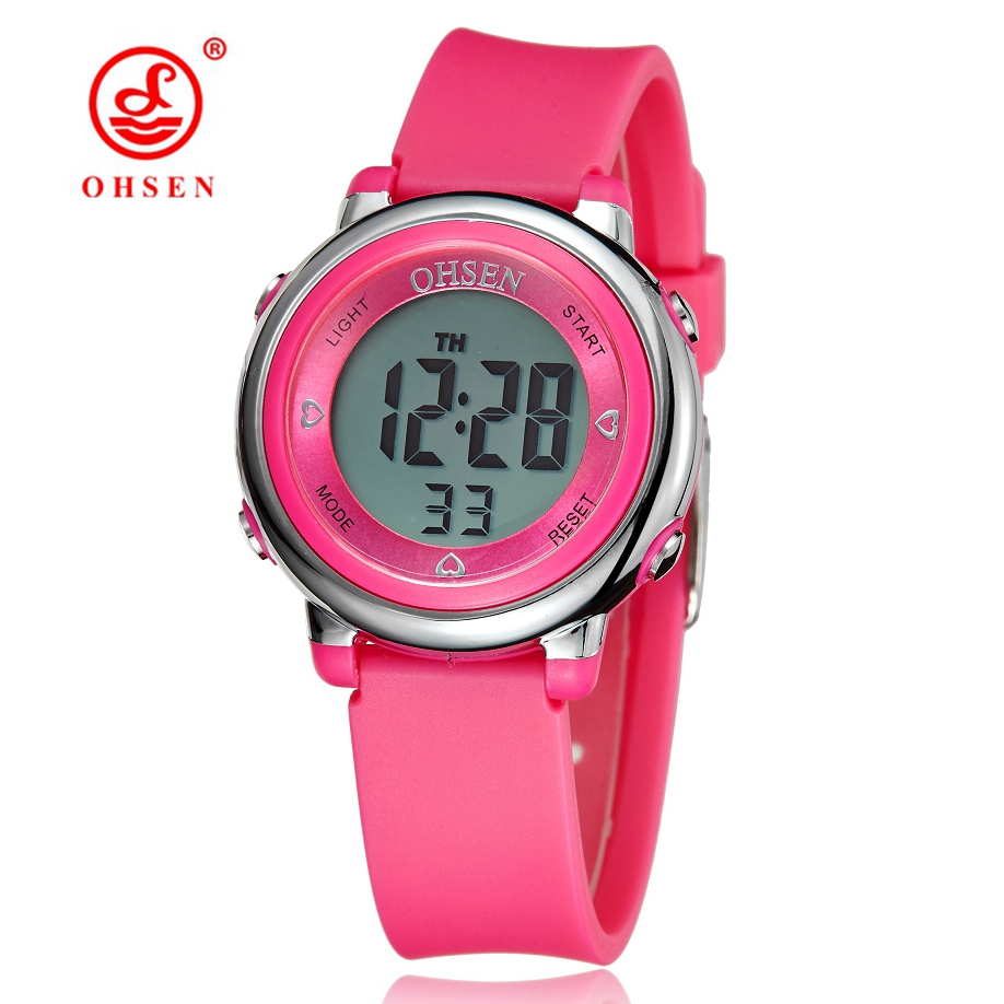 2016 OHSEN бренд цифровой ЖК-дети девушки мода наручные часы милый розовый Каучуковый ремешок 30 М водонепроницаемый Ребенок часы будильник руки часы