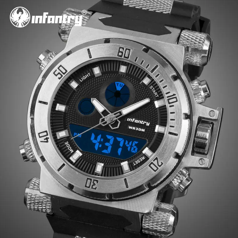 ПЕХОТА Мужская Двойной Цифровой Спортивные Часы СВЕТОДИОДНЫЙ Дисплей Наручные Часы Каучуковый Ремешок Кварцевые Часы Мужской Часы 2016 Relojes Hombre