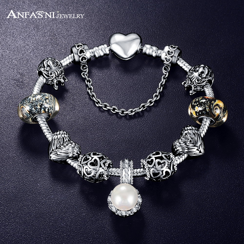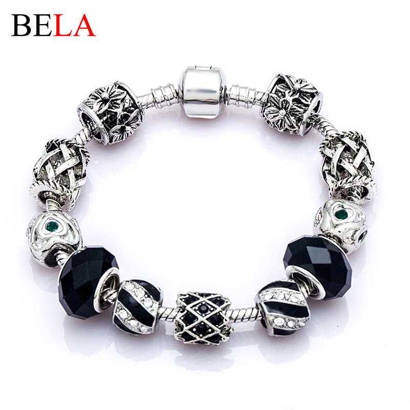 Изысканный Серебряный Кристалл Браслет 925 для Женщин Серебряная Змея Цепи и Муранского Стекла Черный Бисер Браслет Подлинные Ювелирные Изделия