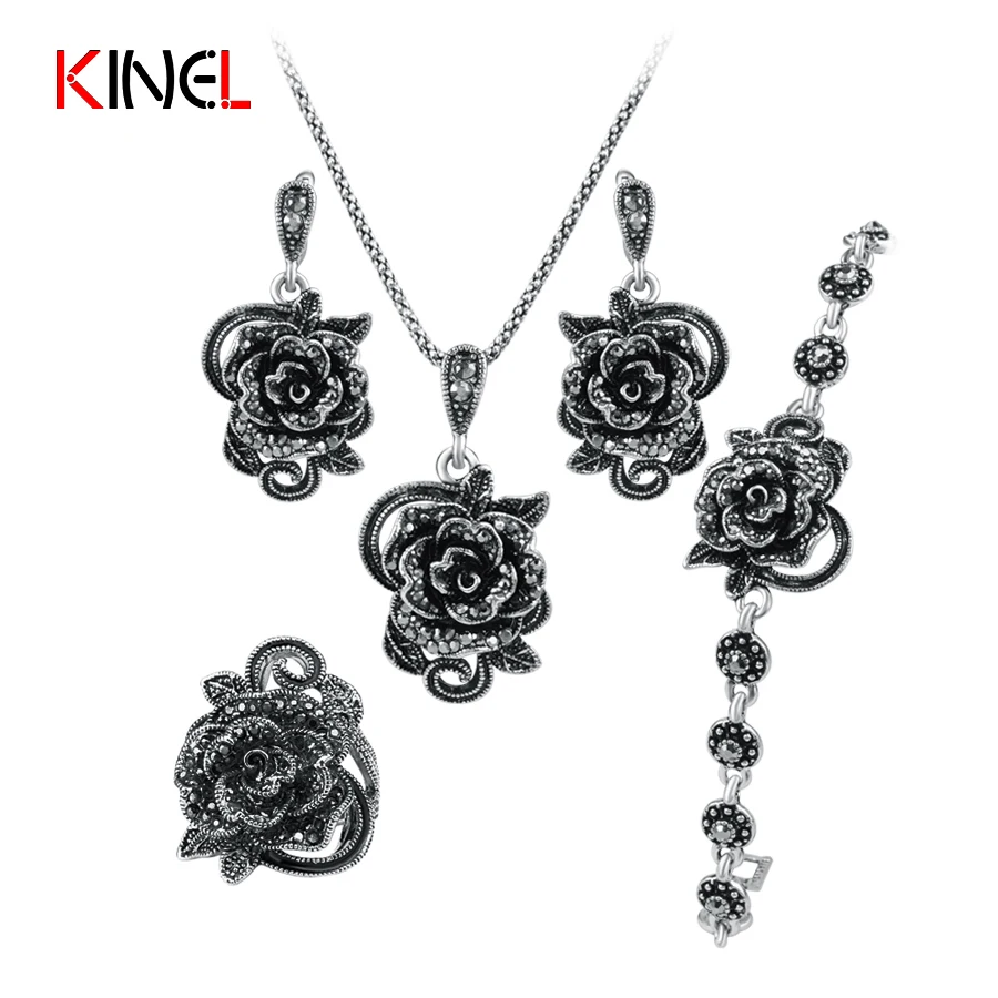 Кинель Марка Розы Черный Кристалл Комплект Ювелирных Изделий Покрытие Древний Серебряный 4 Шт./компл. Винтаж Свадебные Украшения Для Женщин