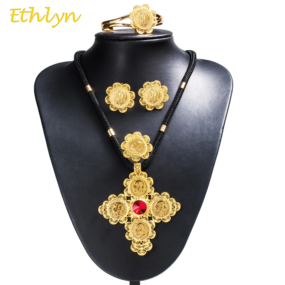 Ethlyn 2017 DIY Черный Веревку Цепи Каменный Крест Монеты Эфиопских Женщин Ювелирные Наборы Позолоченные Африканский Свадебный Романтический Ювелирные Изделия S92