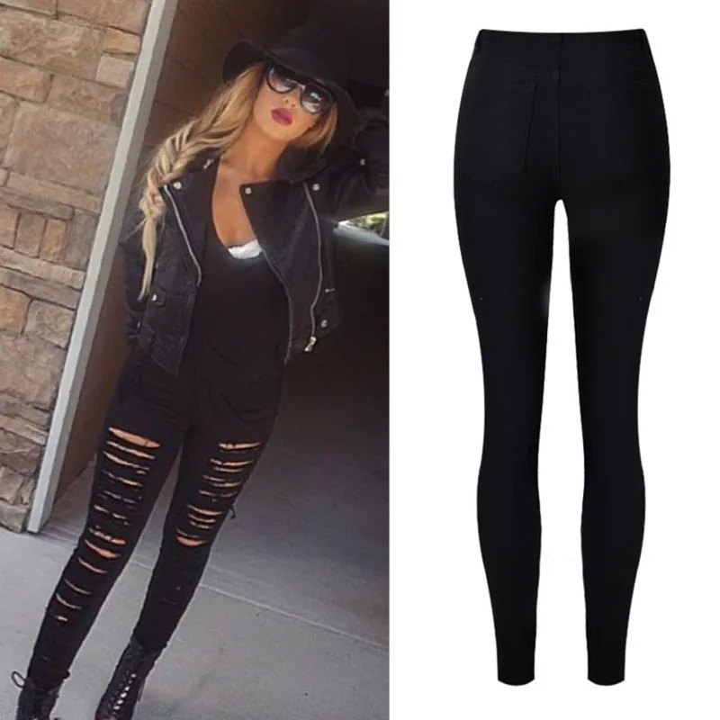 Женщины Тощий Разорвал Брюки Карандаш Высокой Талии Эластичные Джинсы Тонкий Boyfriend Джинсы Женские Стрейч Рваные Черные Джинсы Плюс Размер EG6305