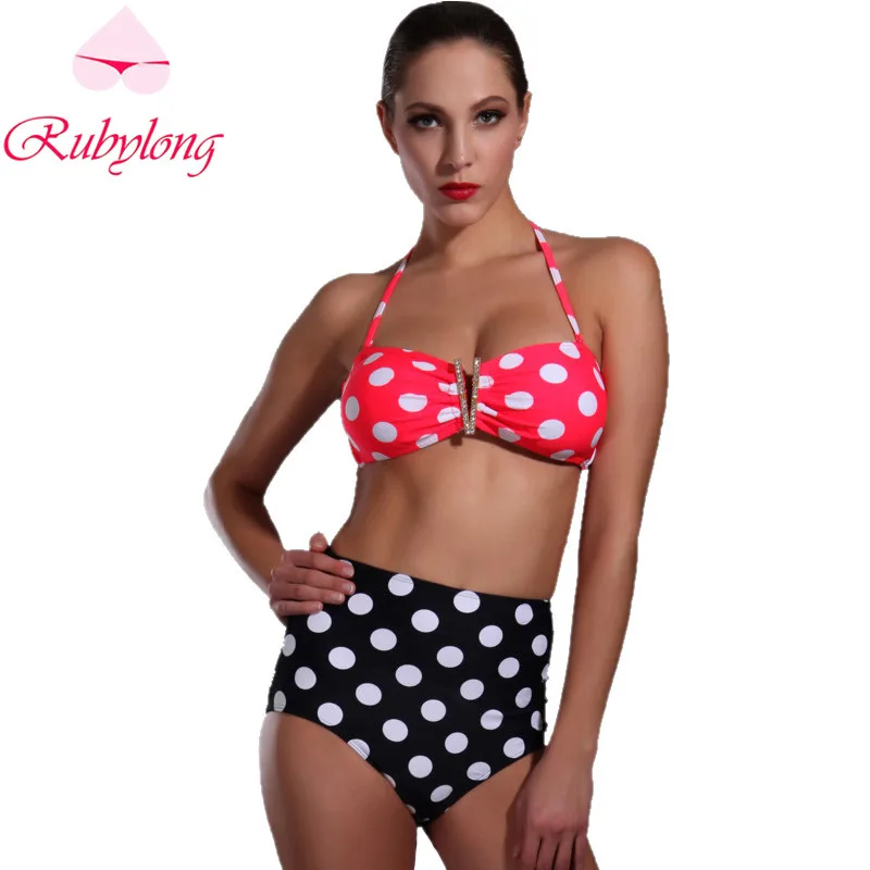 Rubylong 2016 Горячая Высокая Талия Бикини Женщин Купальники Sexy Холтер Push Up Белая Точка Купальник Бикини Set Пляжная Купальный Костюм
