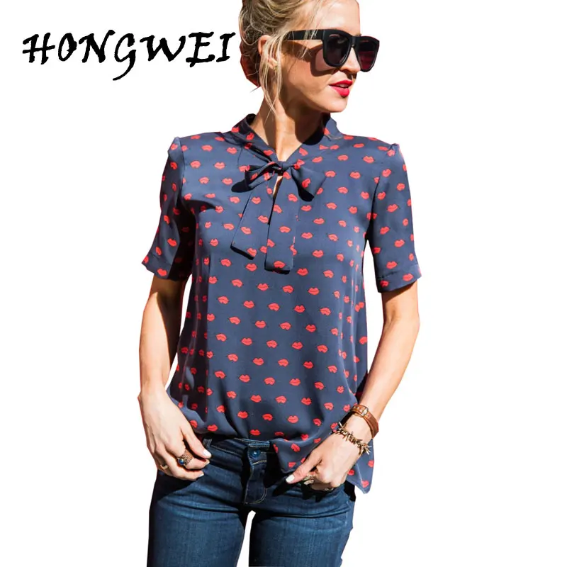 Hongwei Kawaii New Women Chiffon Blouse Shirt Short Sleeve V Neck Fashion White Red Lips Prints Summer Autumn Female Korean Tops